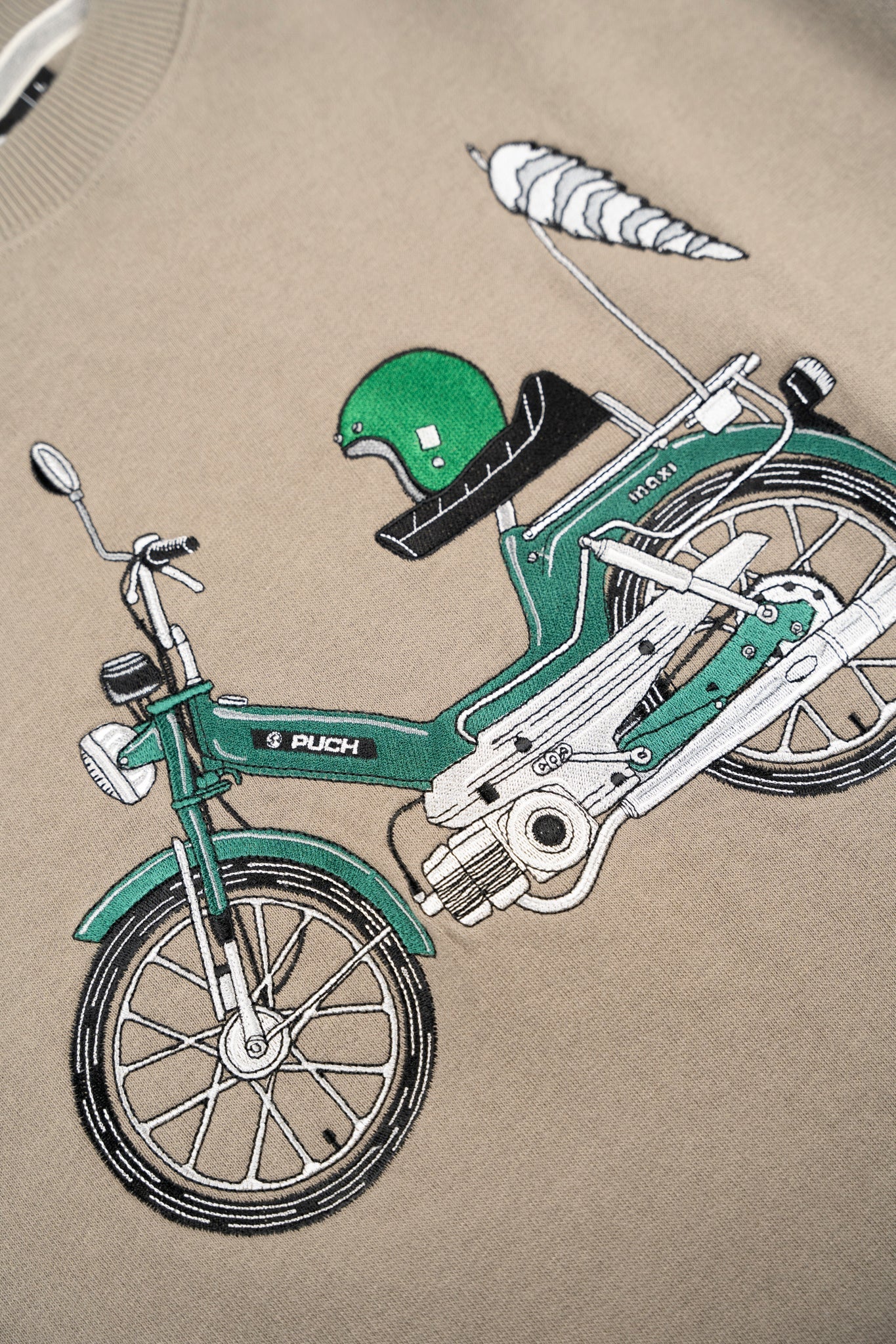 Dette design portrætterer piedestalen af den menneskelige formåen og er kulminationen på den industrielle revolution: Den grønne Puch Maxi Sport…med rævehale!