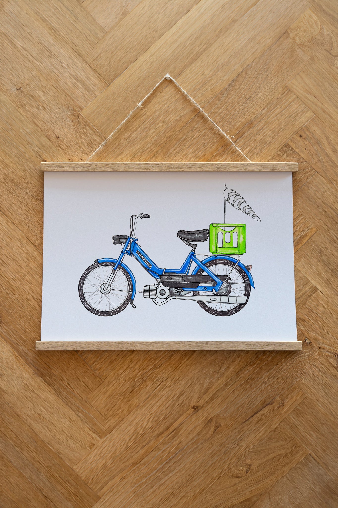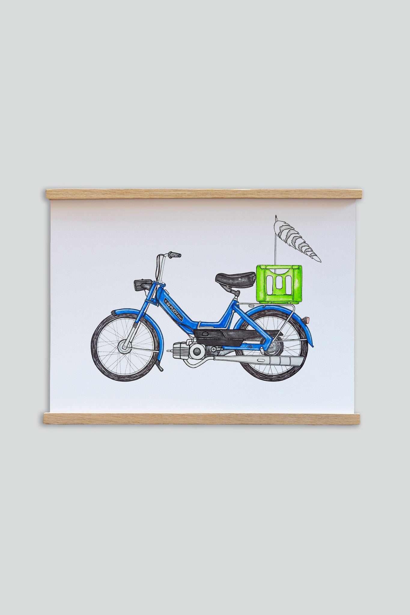 Dette design portrætterer piedestalen af den menneskelige formåen og er kulminationen på den industrielle revolution: Den blå Puch Maxi…med rævehale!