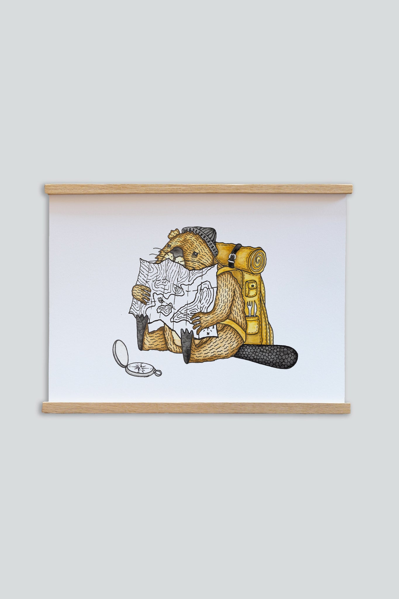 Indgangen til en bæverhytte er under vandoverfladen, og bævere er derfor fremragende til at navigere i vandet. På landjorden er alting mere bøvlet. På dette design ses en bæver i sekunderne før den, i en blanding af sult og frustration, æder sit landkort. #hangrybeaver