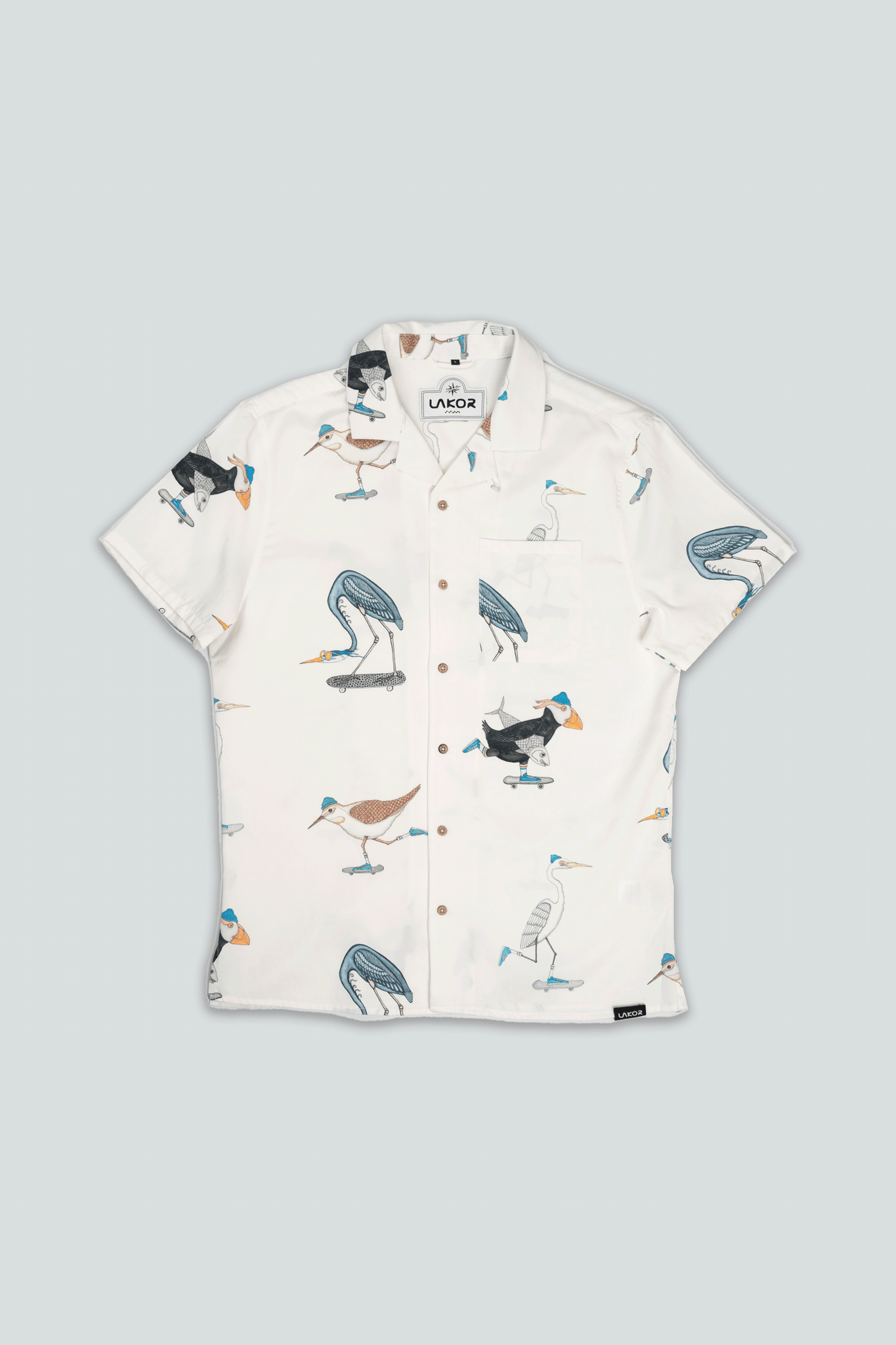 Skating Birds er skjorten, der beviser, at fugleliv ikke kun handler om at flyve sydpå – men også at gøre det med stil. Denne skjorte er dækket af velkendte, fjerklædte venner, som hver især har vendt naturens spilleregler på hovedet.
